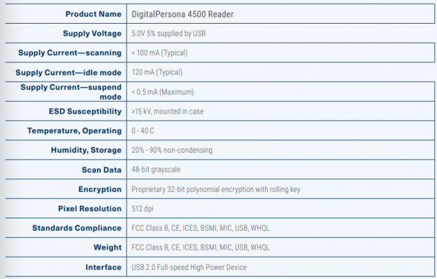 Đầu đọc dấu vân tay DigitalPersona 4500 là thiết bị ngoại vi có cổng USB hoàn hảo cho từng người dùng đặt trên bàn, cũng như nhiều người dùng trong môi trường dùng chung. Thiết kế nhỏ gọn của nó giúp tiết kiệm không gian bàn làm việc trong các doanh nghiệp, và vẻ ngoài chuyên nghiệp, hiện đại của nó trông thanh lịch trong môi trường hiện đại. DigitalPersona 4500 Reader sử dụng công nghệ quét vân tay quang học để đạt được chất lượng hình ảnh tuyệt vời, diện tích chụp lớn và độ tin cậy vượt trội. Một lớp phủ silicon cho phép nó đọc một loạt các dấu vân tay một cách chính xác và nhanh chóng bất kể góc độ vị trí. Vỏ kim loại chất lượng cao chống lại những va đập ở mức độ nhẹ.